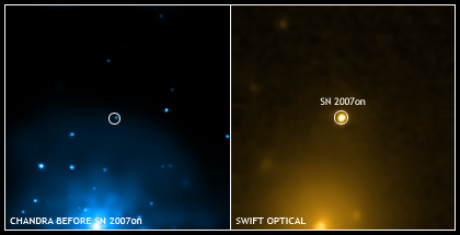 Image showing the pre-supernova X-ray source (left) and a Swift observation of the supernova in November 2007. Image credit Chandra press office.